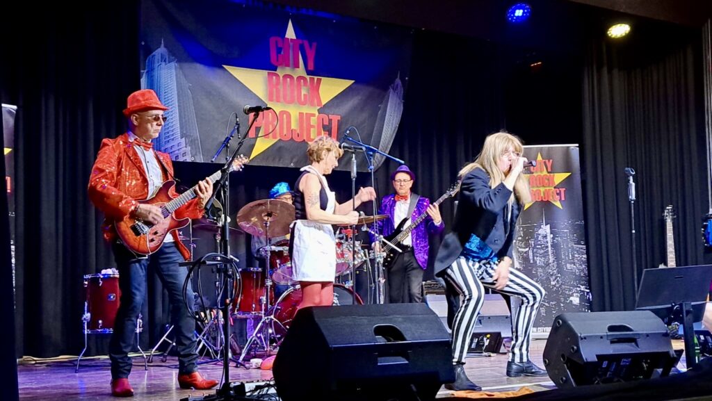 Mutter und Tochter, Helene und Simone Rudolph sorgten mit ihren ganz eigenen, gewaltigen Stimmen für Begeisterung. Matthias Wollny, Gitarre, Ralph Basting, Gitarre und Keyboard, der Basist Andreas Knauf, Gitarre und Gesang und der Drummer Bálint Görbe präsentierten die bekanntesten und besten Songs der Rock und Pop Geschichte. Dem Publikum dargeboten mit pfiffigem Witz, Darstellungskunst, großem musikalischem Können und mitreißender Leidenschaft, was mit viel Applaus und reger Tanzteilnahme belohnt wurde.