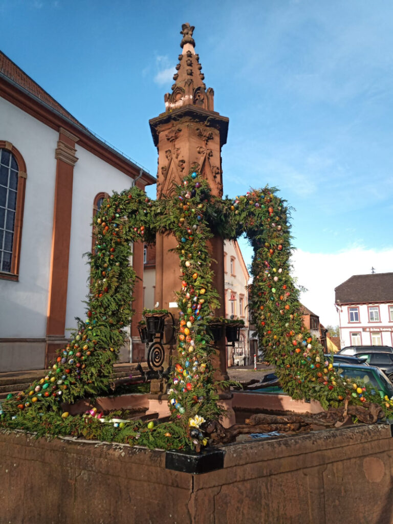 Nach der feierlichen Eiweihung des Osterbrunnens um 16:30 Uhr durch Stadtbürgermeister Daniel Poth in Begleitung der Pfarrerin der Protestantischen Kirchengemeinde, Judith Geib, und eines Vertreters des Katholischen Pfaramts sowie eines Schulchors gibt es eine kleine Pause. Der Kirchbauverein übernimmt die Bewirtung der Gäste mit Getränken.